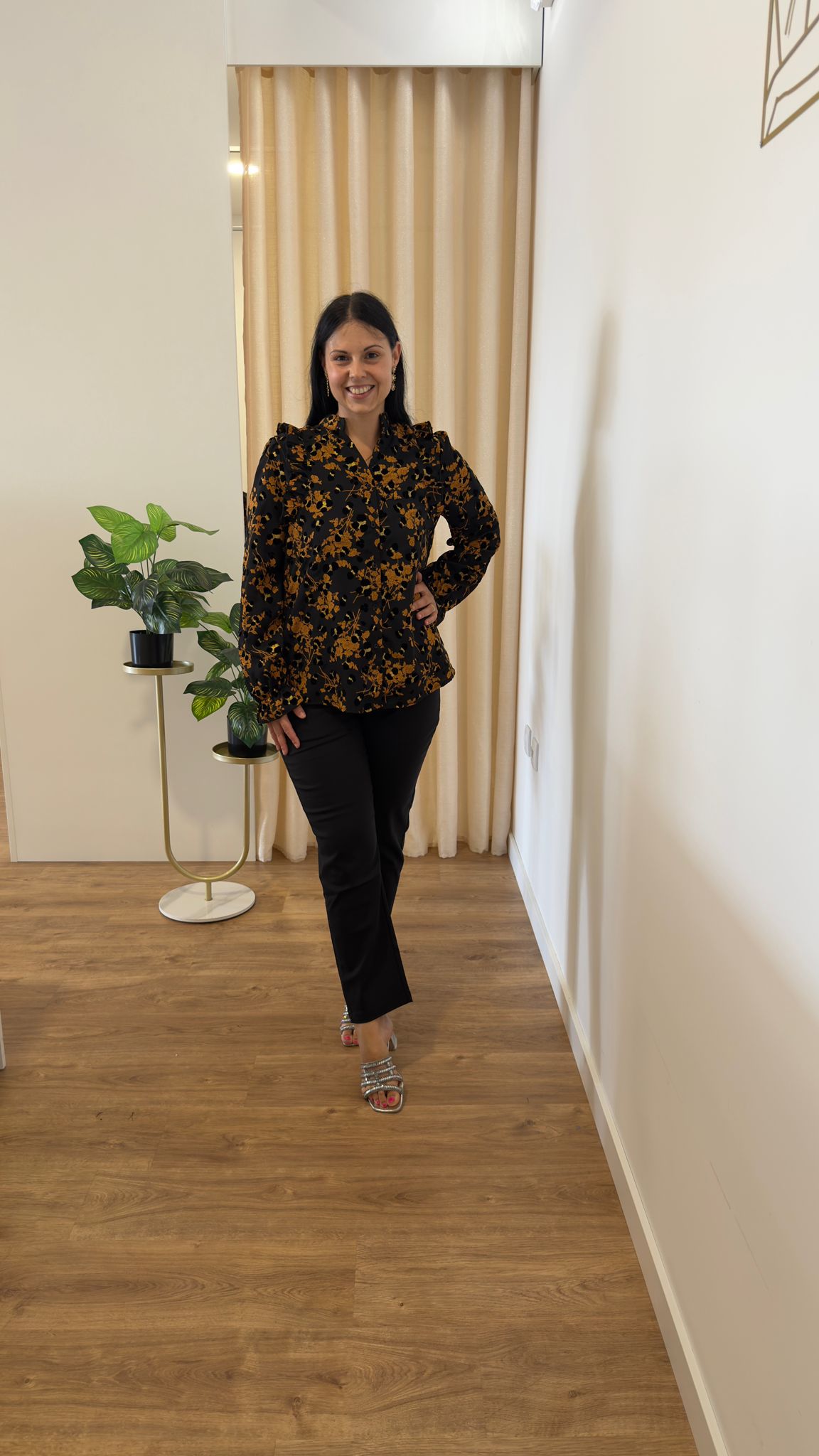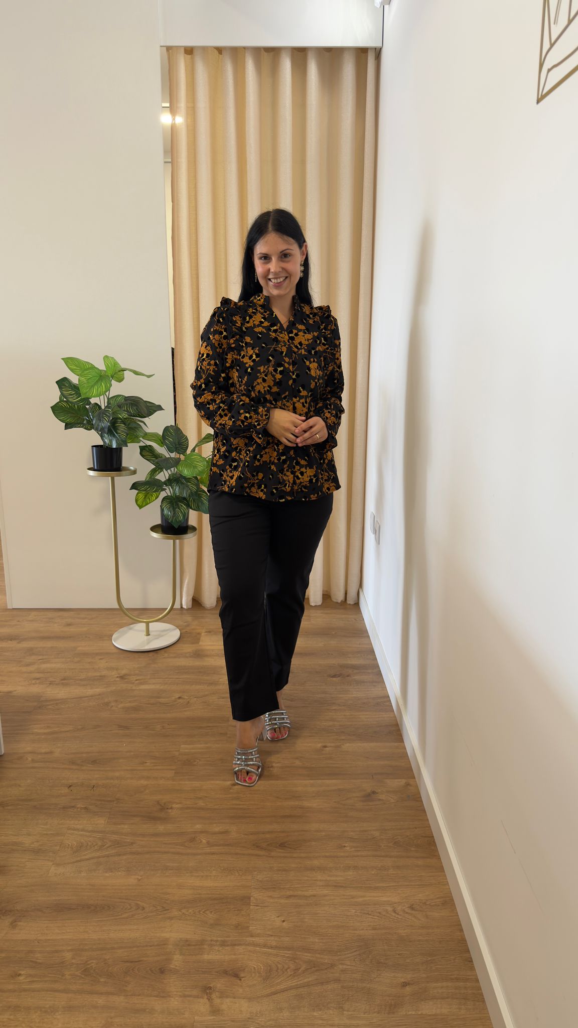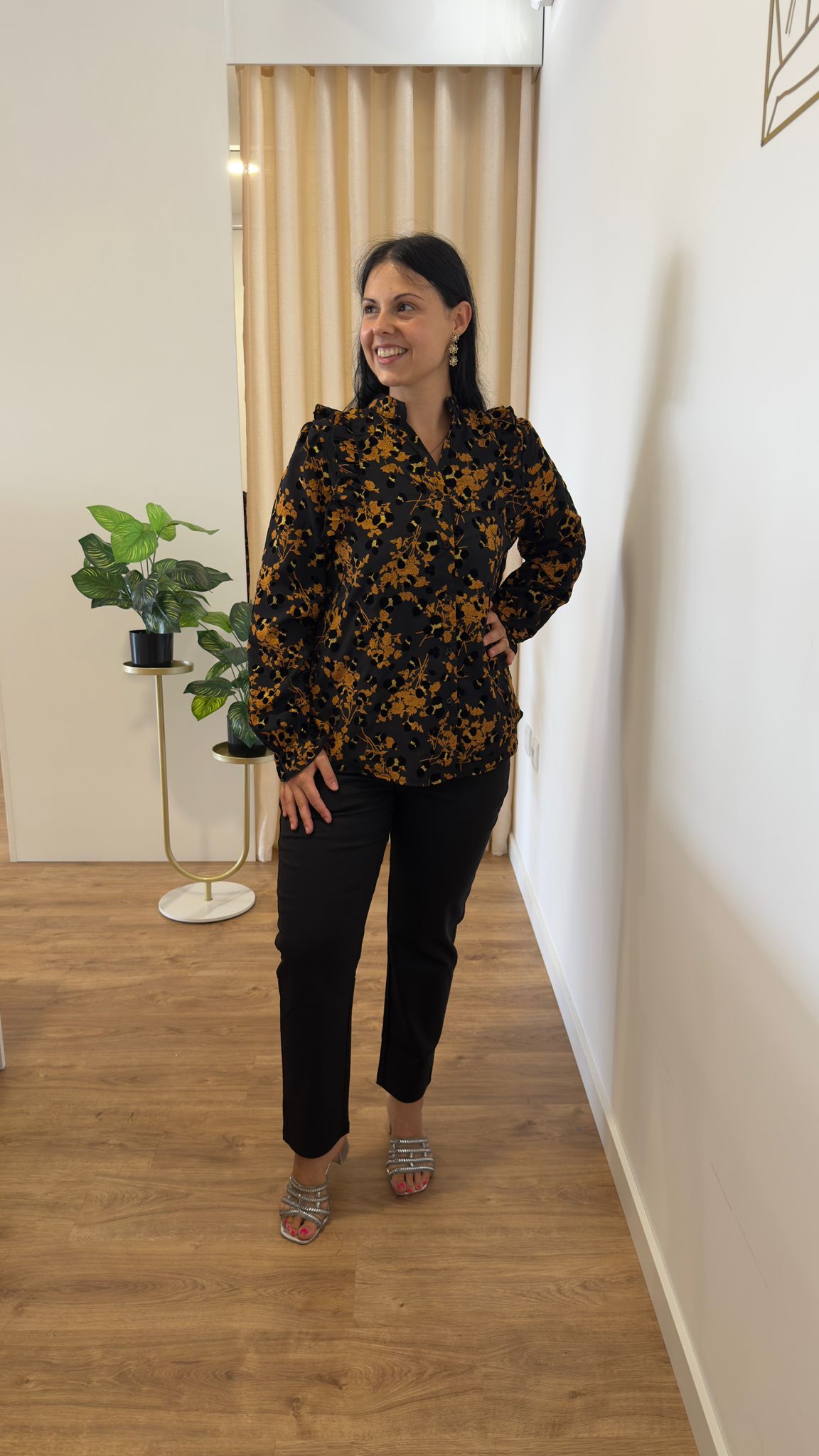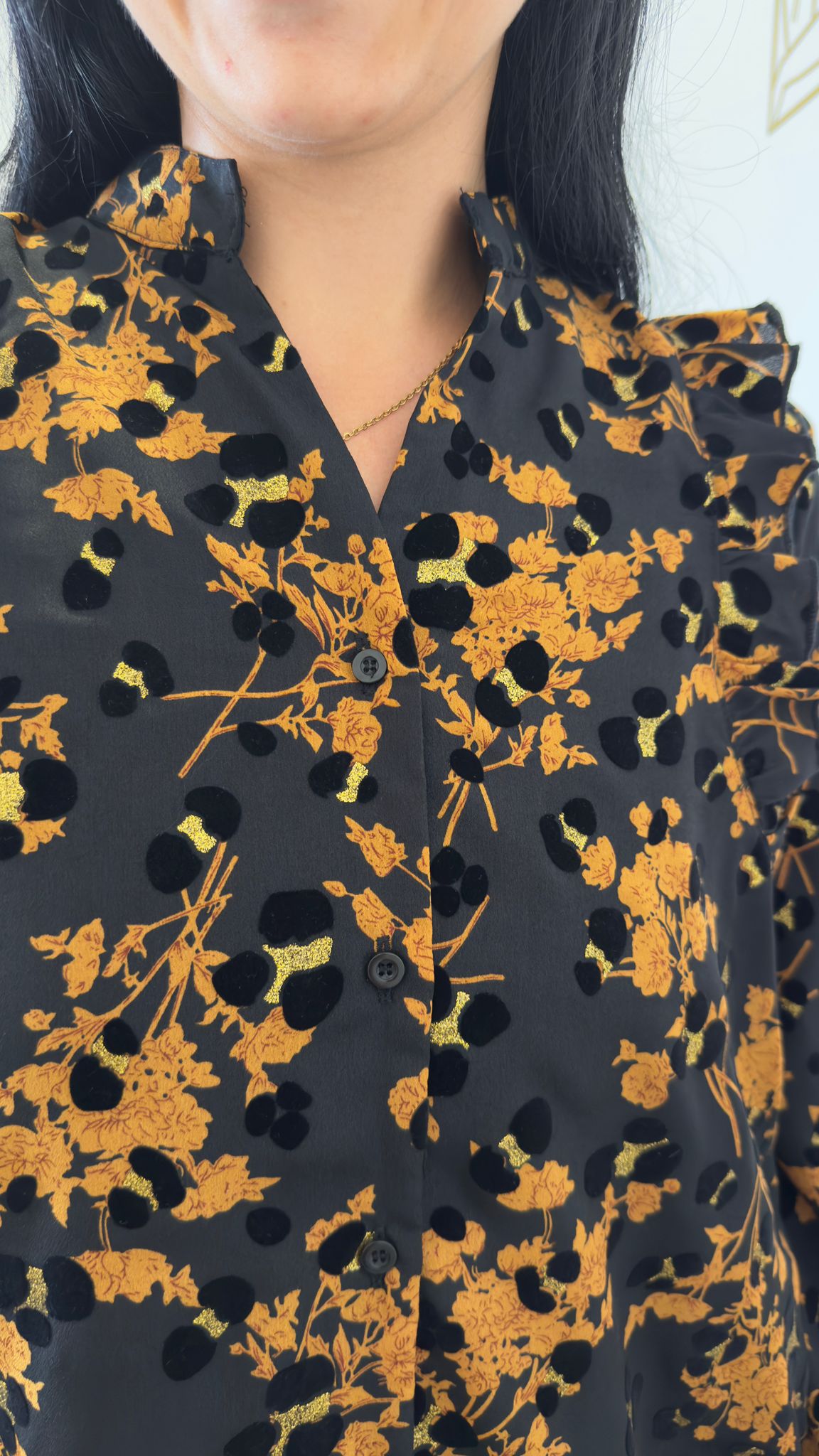 Camisa com pormenores fantástico em dourado e bolinhas em veludo preto