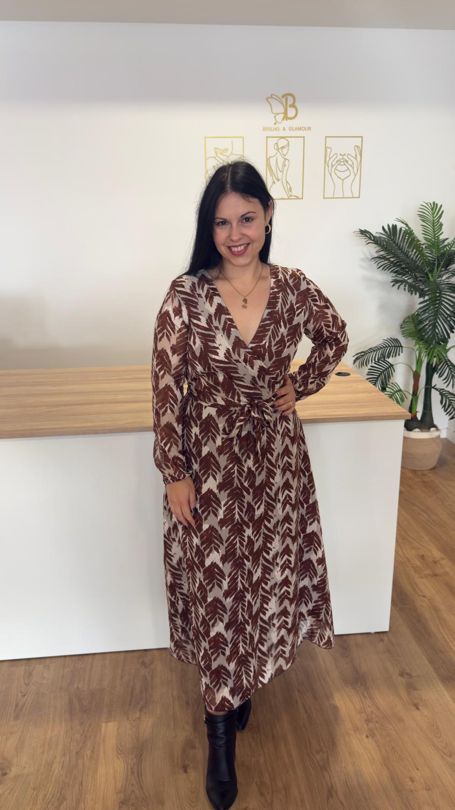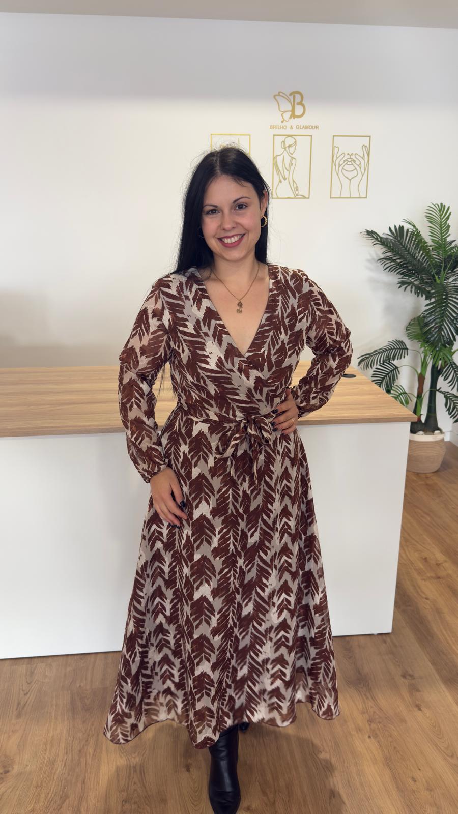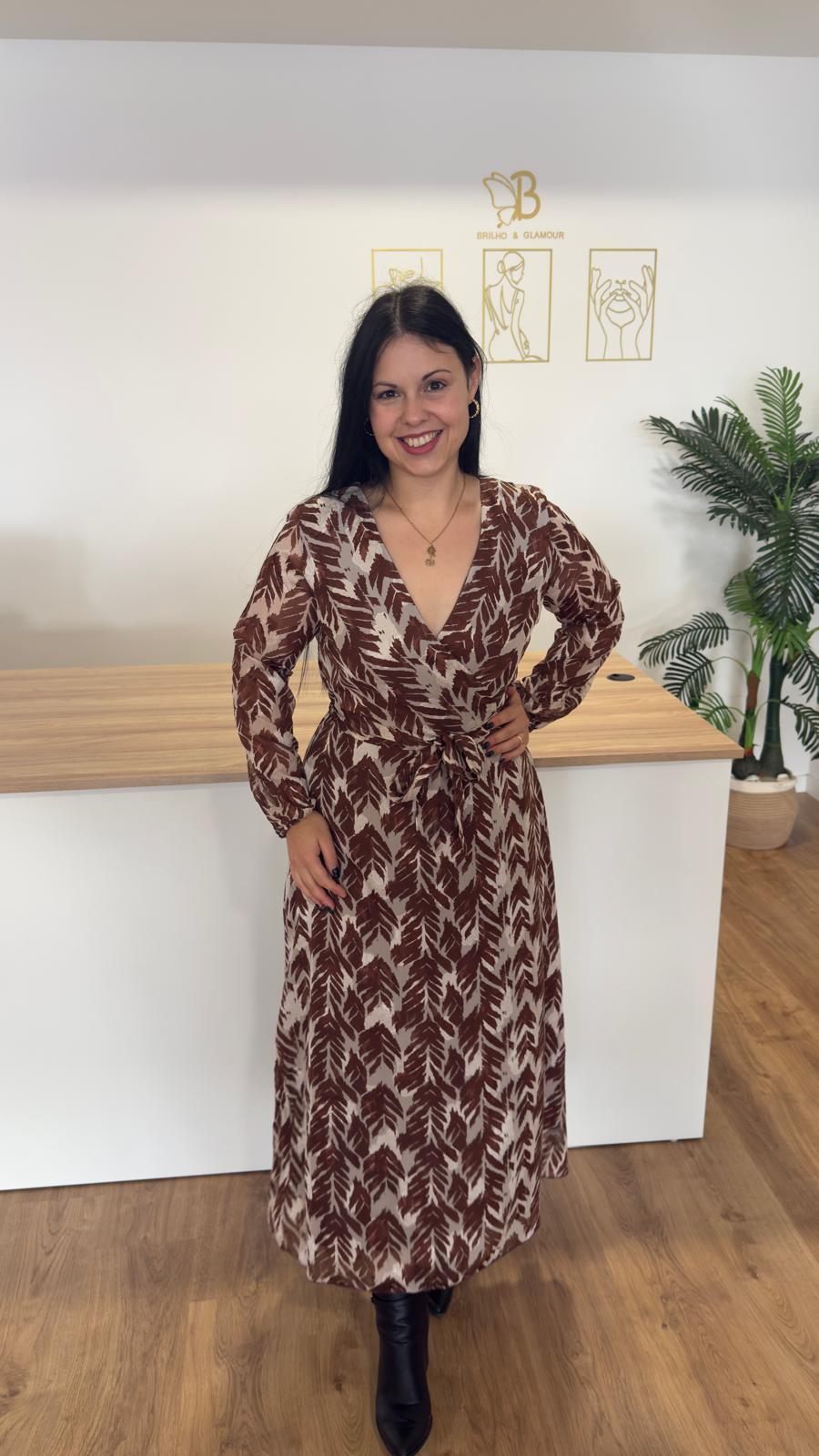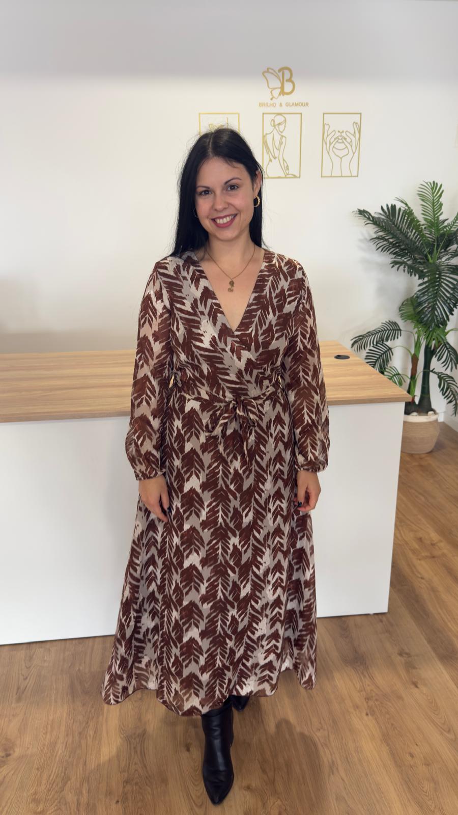 Decote cruzado, elástico abaixo do peito e cinto no mesmo tecido