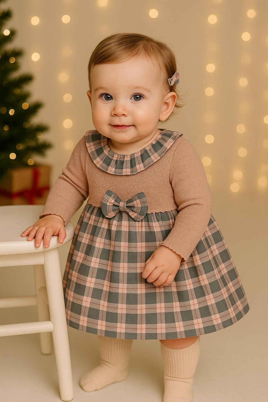 Vestido maravilhoso em malha na parte superior Parte de baixo com padrão xadrez Todo forrado Gancho no mesmo padrão xadrez